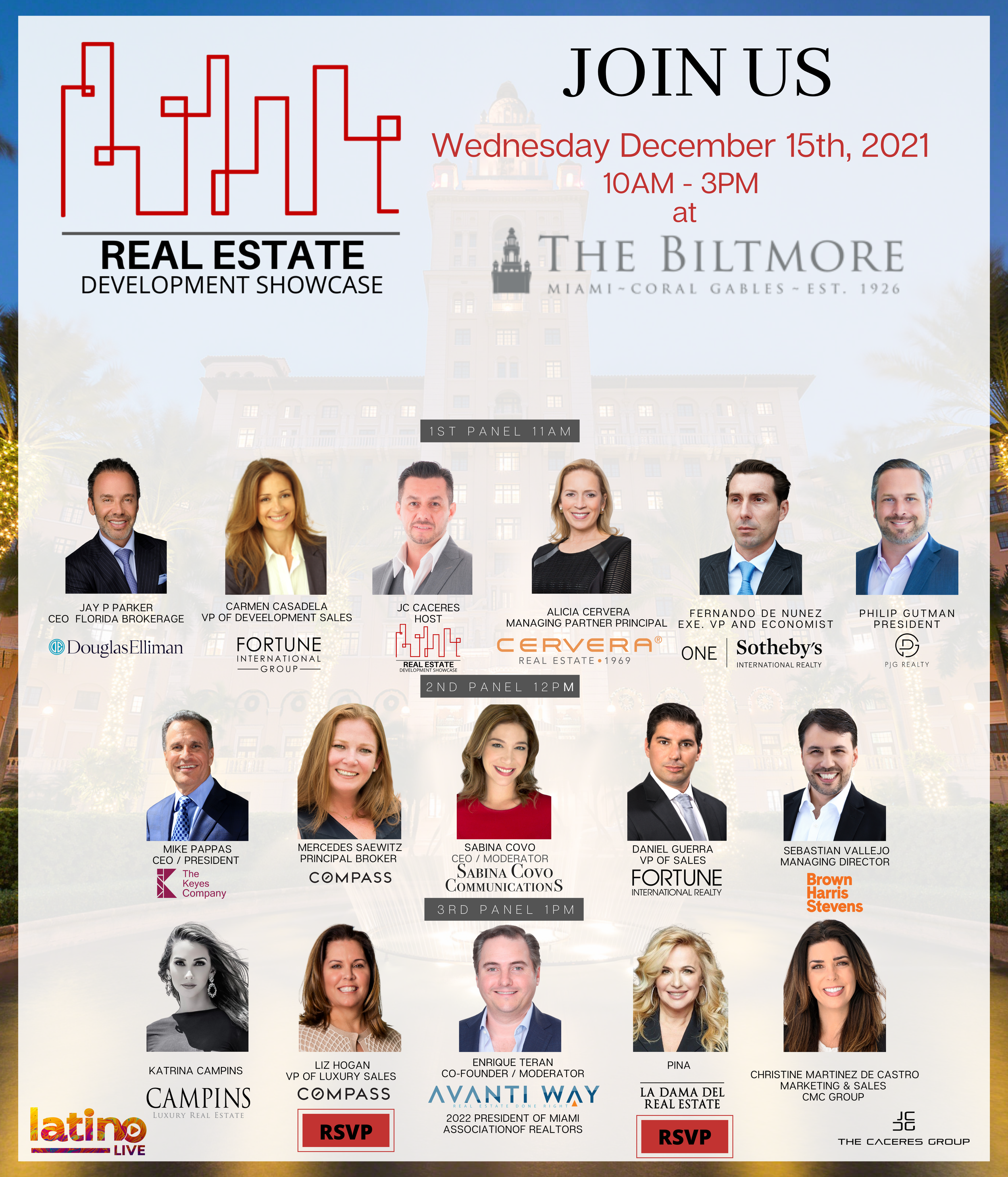 The Real Estate Development Showcase invites you to join us as South Florida's real estate leaders discuss the current market At The Biltmore Hotel December 15th, 2021. Speakers include executives running top real estate organizations and top producers in South Florida. They will discuss their career experiences and the current market.