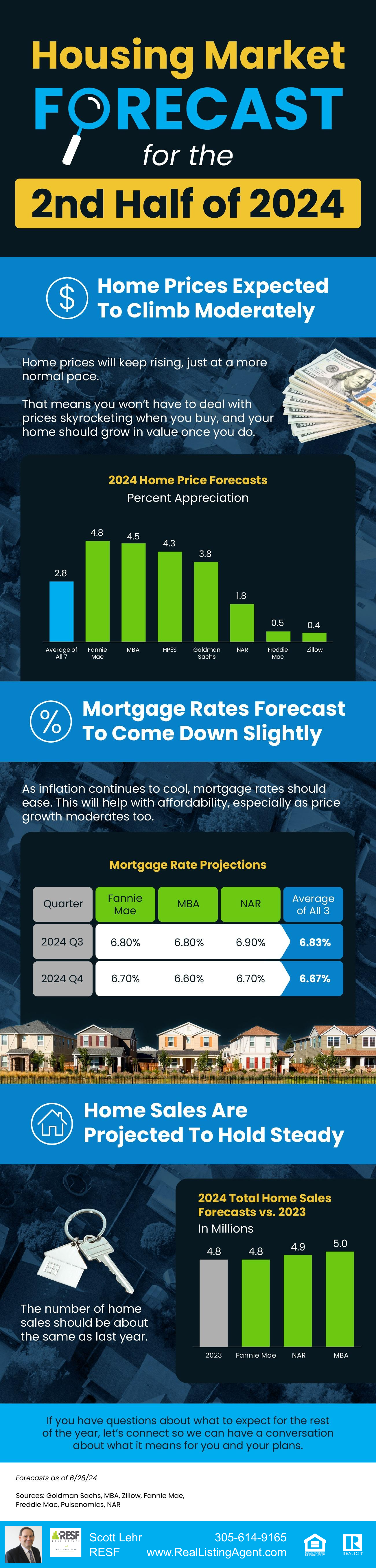 Wondering what the second half of the year holds for the housing market? Here’s what expert forecasts say. Home prices are expected to climb moderately. Mortgage rates are forecast to come down slightly. And, home sales are projected to hold steady. If you have questions about what to expect for the rest of the year, DM me so we can have a conversation about what it means for you and your plans.