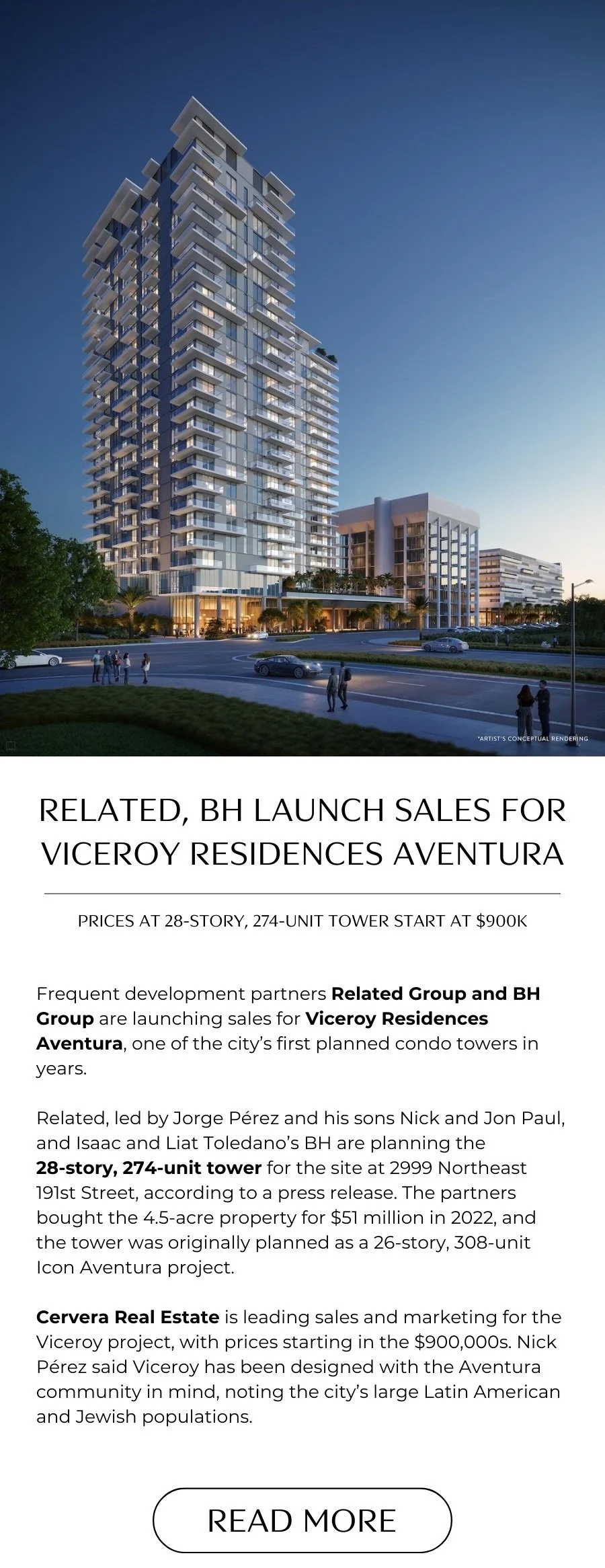 Frequent development partners Related Group and BH Group are launching sales for Viceroy Residences Aventura, one of the city's first planned condo towers in years. Related, led by Jorge Pérez and his sons Nick and Jon Paul, and Isaac and Liat Toledano's BH are planning the 28-story, 274-unit tower for the site at 2999 Northeast 191st Street, according to a press release.