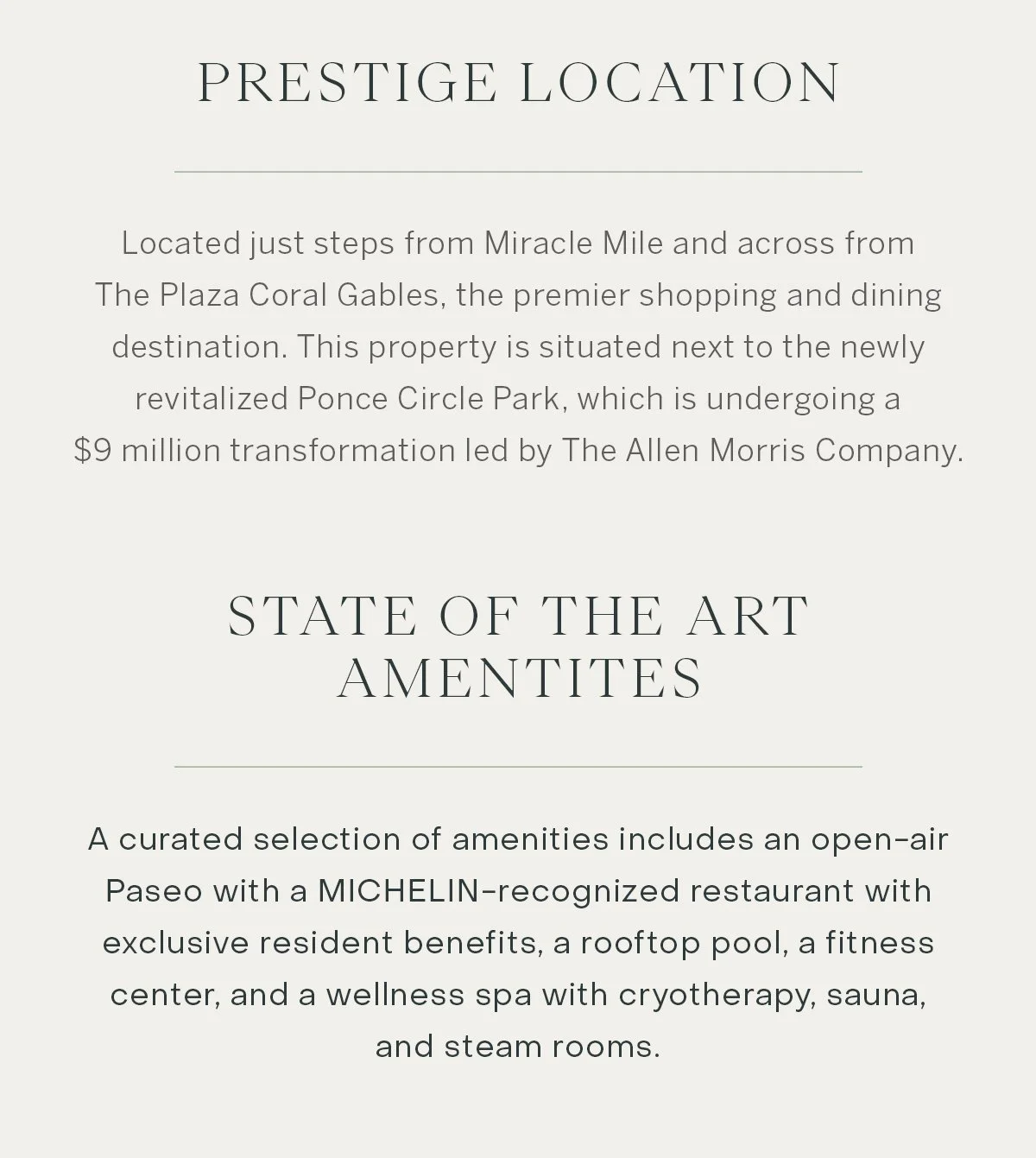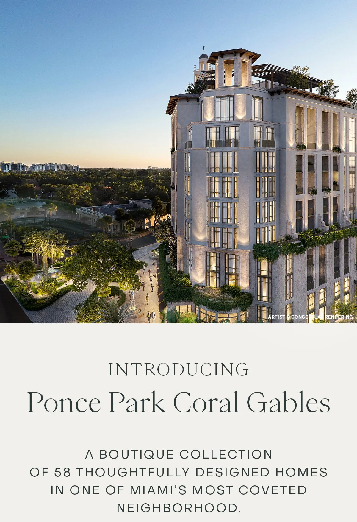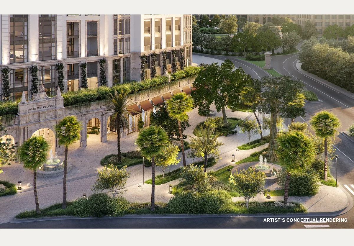 Ponce Park will be an 11-story, 58-residence boutique building on 3000 Ponce de Leon Blvd, perfectly located just steps from The Plaza and Miracle Mile, the ultimate destinations for shopping and dining.  With two years of meticulous approval, its architecture is poised to set a new golden standard in Coral Gables. The building will offer a curated lifestyle: a rooftop water oasis with full services, a wellness center, SPA garden, and 25,000 square feet of retail space, including a Michelin-starred restaurant, a high-end bistro, and a Mediterranean-style paseo. The surrounding area will feature world-class green space rivaling Europe's finest, including a $9.3M transformation of Ponce Circle, a 1.5-acre park.